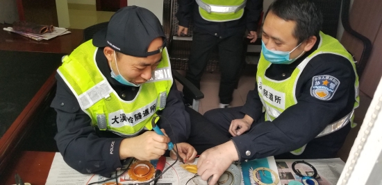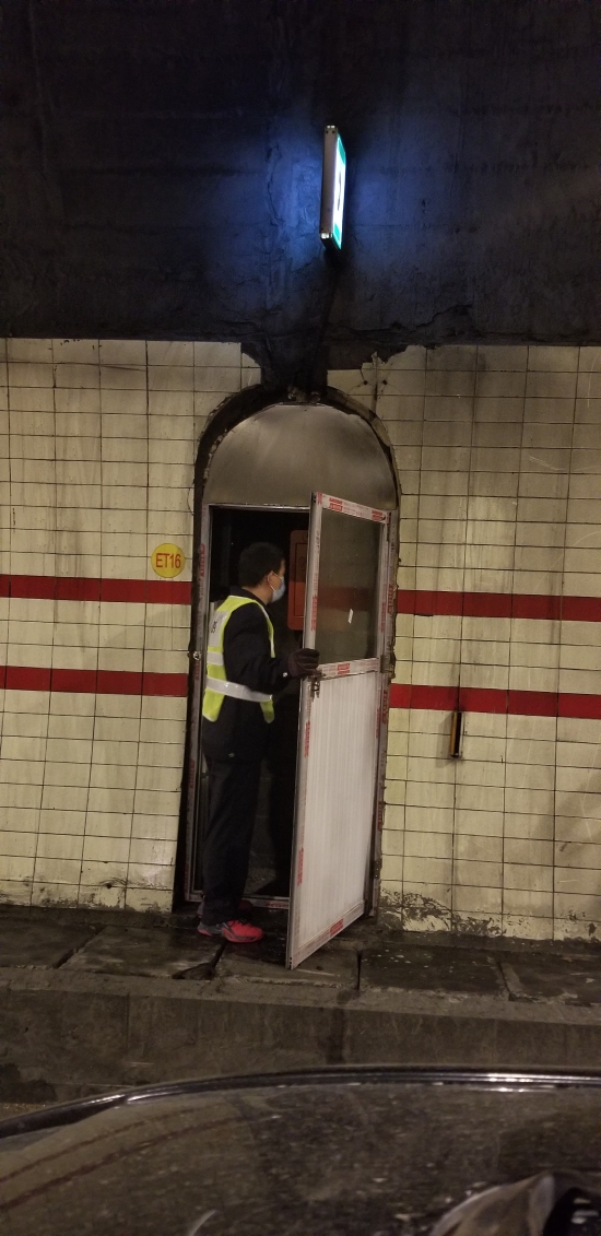 圖為工作人員在檢修緊急電話 此次隧道清洗,隧道所員工加班加點,檢查隧道內消防箱、檢修隧道風機和加強燈回路、修理故障的語音提示,對配電房機電設備進行除塵保養,還檢測了火災報警、緊急廣播、緊急電話等系統。