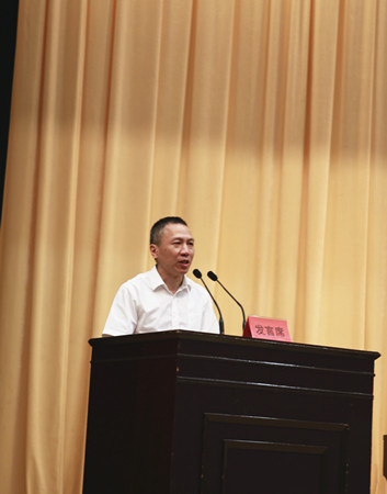 圖為集團(tuán)黨委副書記、副董事長(zhǎng)、總經(jīng)理張建平在主席臺(tái)上作交流發(fā)言