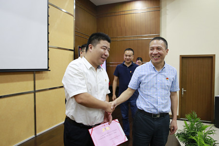 圖為集團副董事長、總經(jīng)理張建平與第一名選手握手