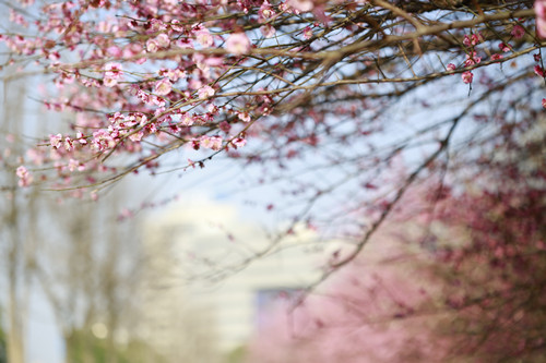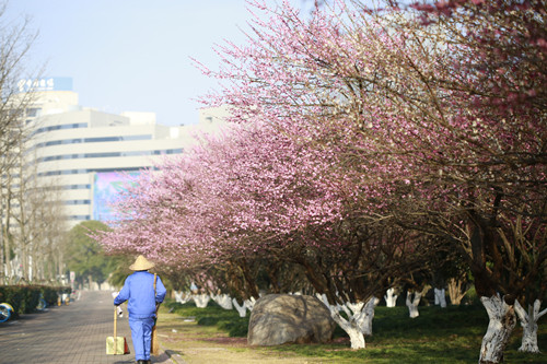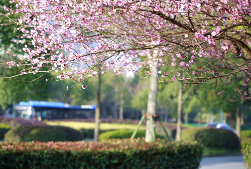 最后一站,便是市民廣場(chǎng),我見過的最美公交站臺(tái)。初春的清晨啊,一下車便有沁香拂散,迎接我下車的那是大片繁花盛開呀,路邊草地一溜的紅梅、白梅,在藍(lán)天下絢爛地肆無忌憚地綻放。呵,是的,還有藍(lán)天,最近流行的一個(gè)詞叫“臺(tái)州藍(lán)”,忽然想起來,每日公交車上下班,低碳出行,這算是我為“臺(tái)州藍(lán)”添了一筆淡藍(lán)嗎?應(yīng)該是吧。于是,在藍(lán)天紅白花海中,慢慢穿過梅林、小橋、亭子,上班之路竟是如此心情舒緩。 鄭蔚